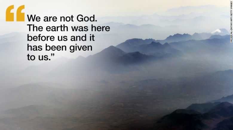 “The earth, our home, is beginning to look more and more like an immense pile of filth. In many parts of the planet, the elderly lament that once beautiful landscapes are now covered with rubbish.”